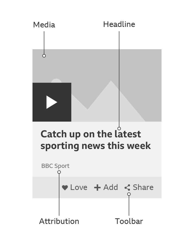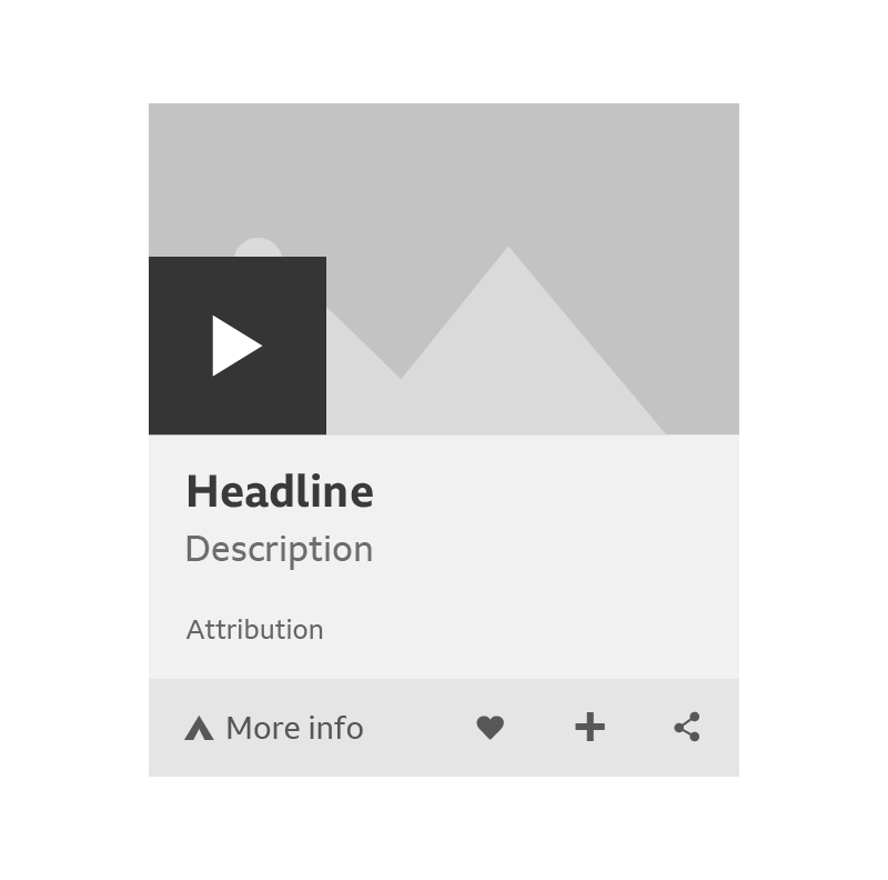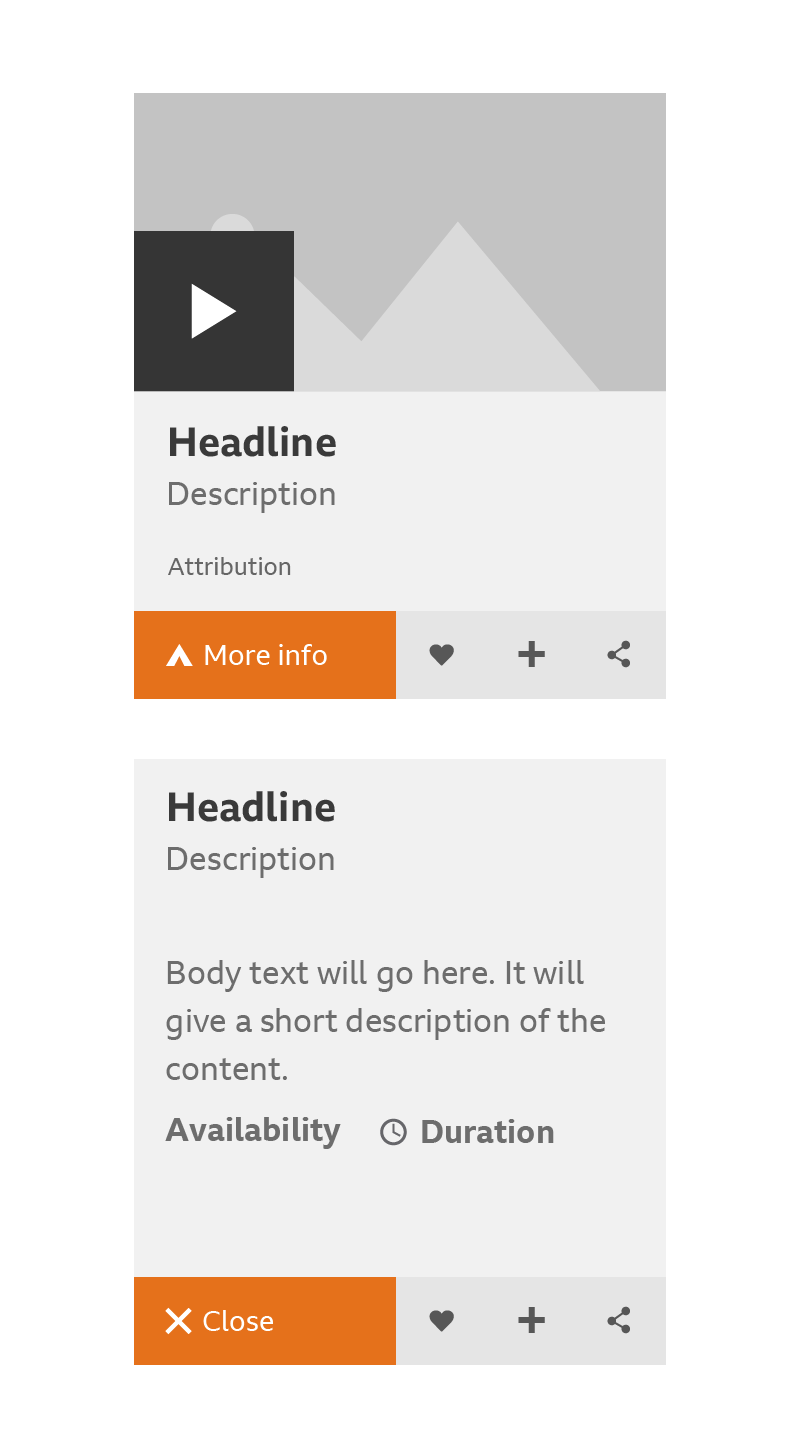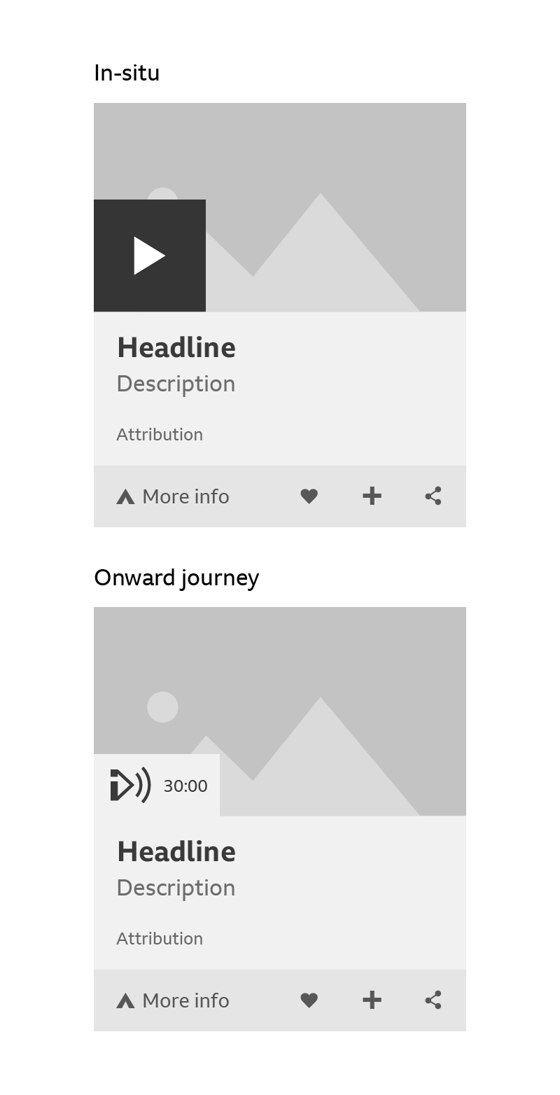 A card can handle media in two ways: the media can play in-situ or it be reached through an onward journey. The play icons for these onward journeys are different. They can include product branding and duration, and they’re coloured the same as the area below the media.