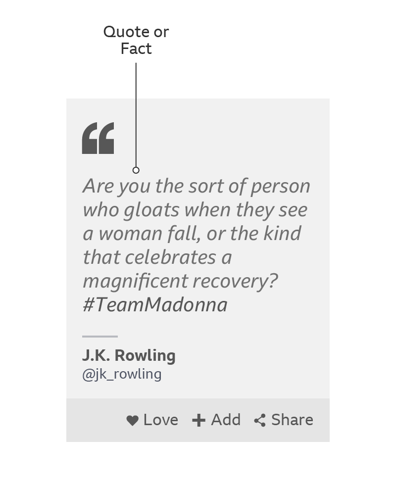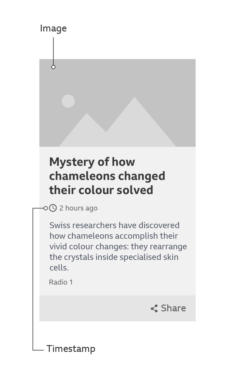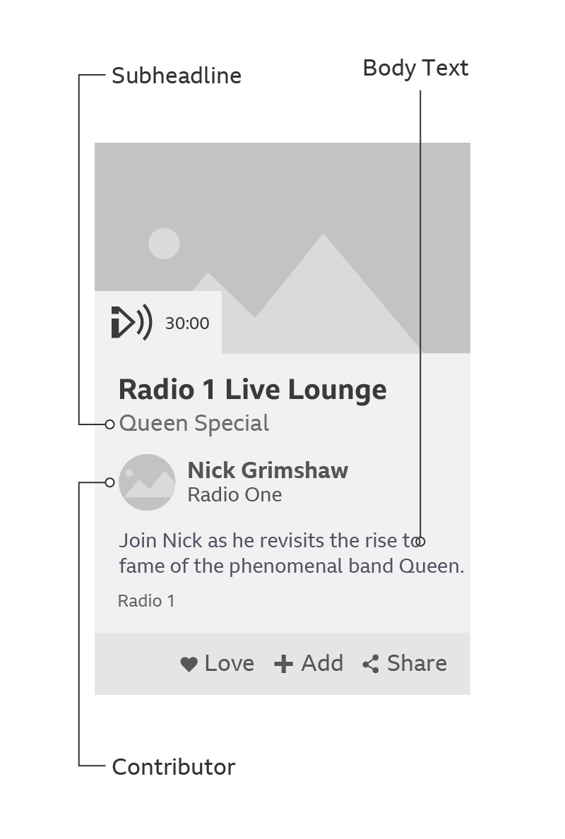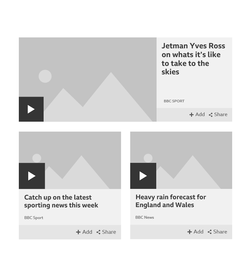 A card can handle media in two ways: the media can play in-situ or it be reached through an onward journey. The play icons for these onward journeys are different. They can include product branding and duration, and they’re coloured the same as the area below the media.