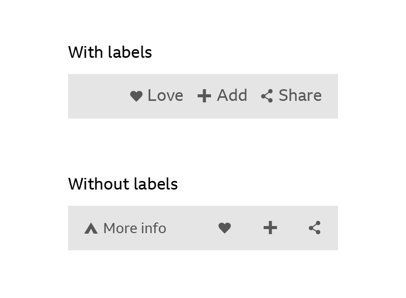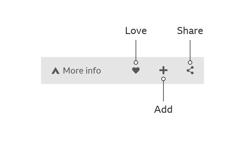 Use labels with the ‘Love’, ‘Add’ and ‘Share’ icons if there’s enough space on the toolbar. If there isn’t enough space, don’t use labels.