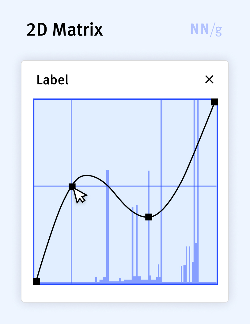 A specialized input control used primarily in complex applications to simultaneously modify multiple related parameters by drawing a complex curve. Interaction with this control typically occurs by clicking on a point on an existing curve, then dragging that point to a new location. 2D matrices are useful when there are two parameters that depend on each other (such as luminance and RGB curves in photo-editing applications) and that will typically be modified together.