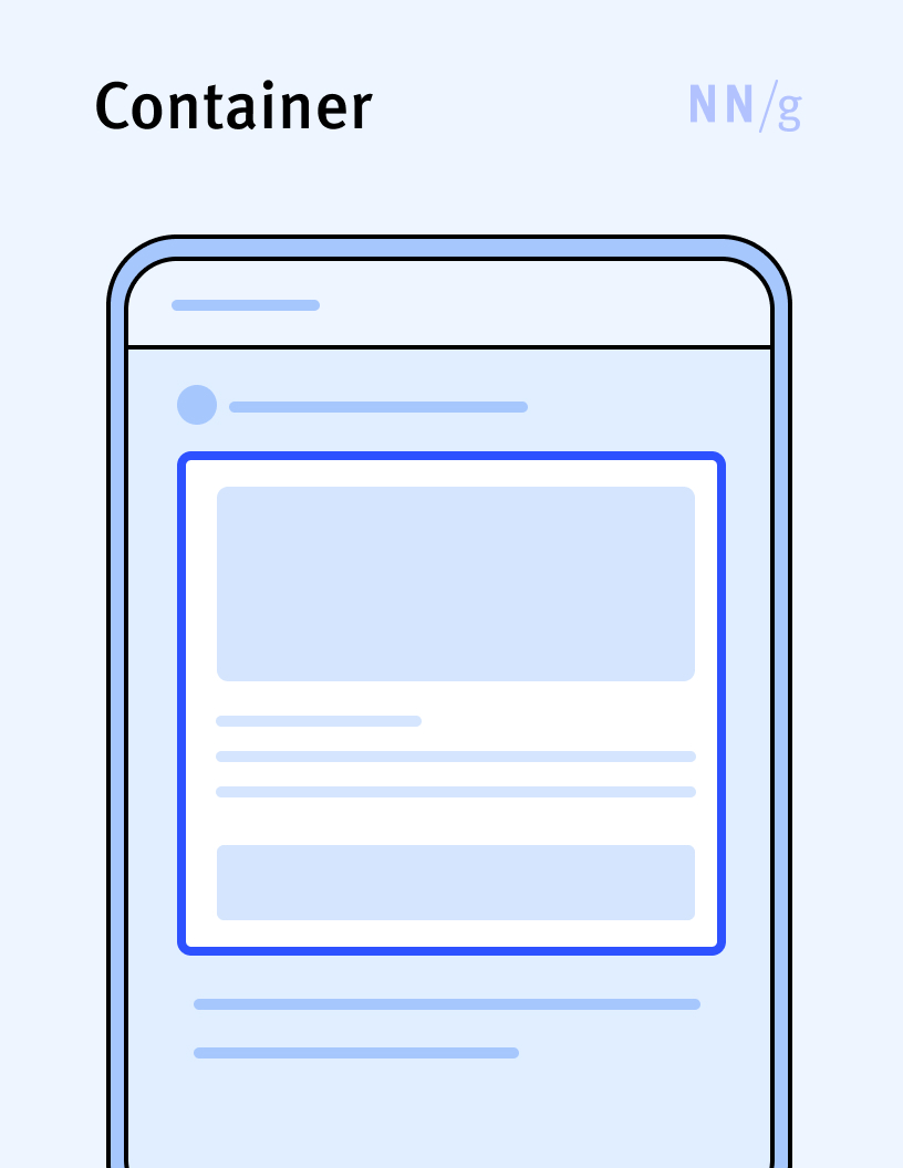 A graphical element used to hold and organize other related UI elements. Containers can include elements such as buttons, words, textboxes, or icons. Containers are usually visually defined through borders, shading, or spacing.