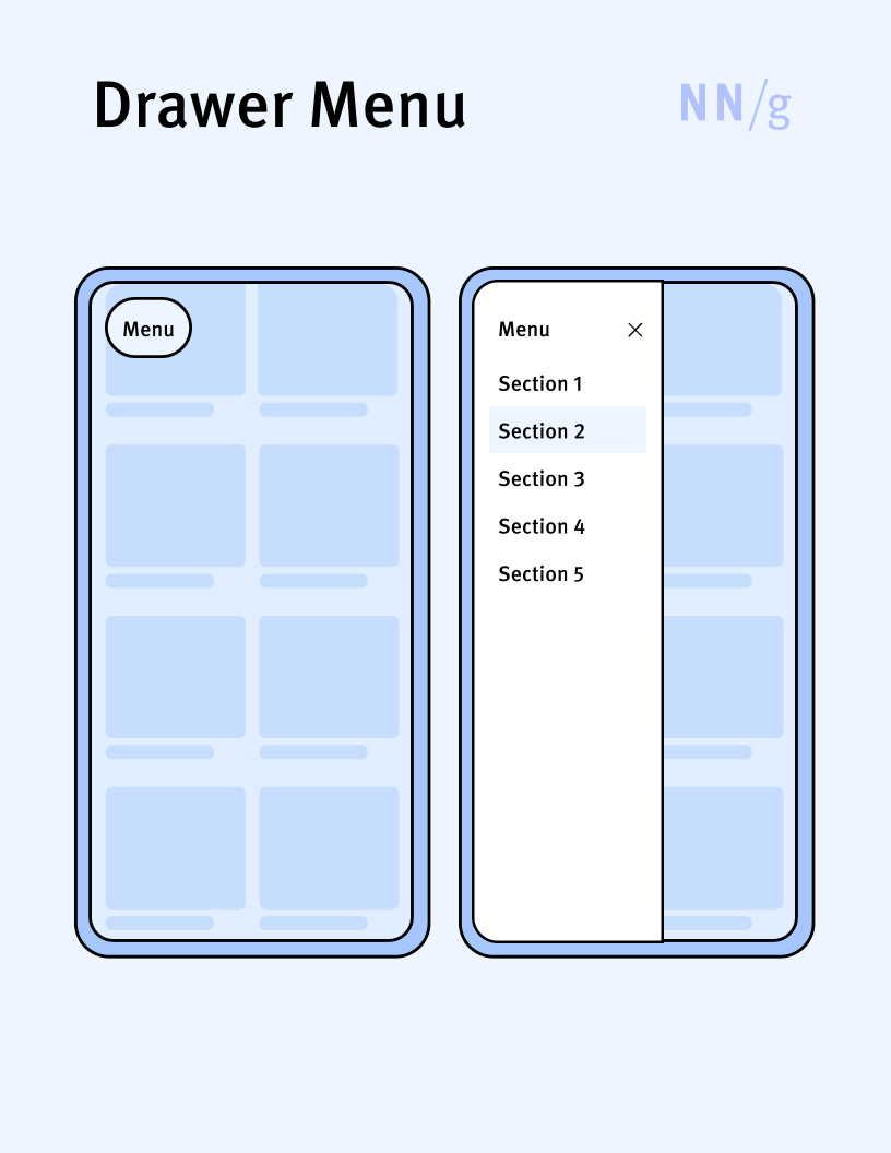 A menu that appears in a side sheet, sliding out from the left or right side of the screen. Drawer menus are popular navigation-menu choice in mobile applications.