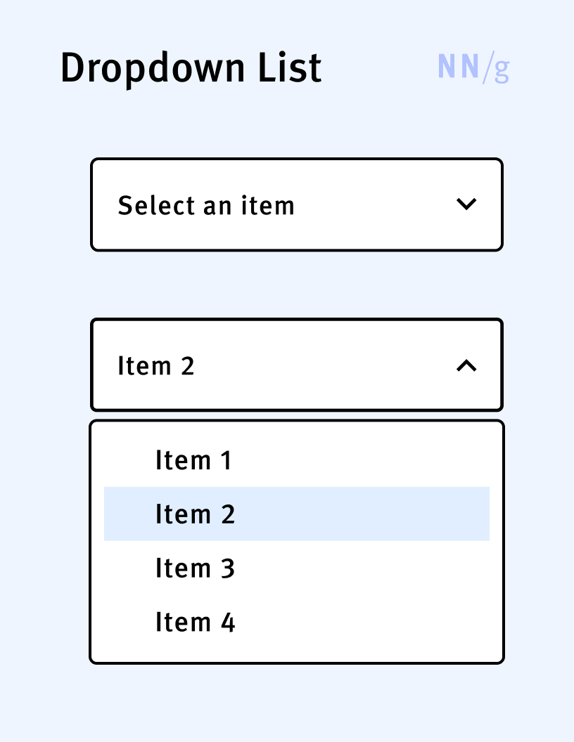 A type of picker that allows users to select one option from a list of options. It has three components: a label, an arrow button, and a list of options. By default, the list is hidden. When the arrow is clicked, the list is displayed, showing several options that the user can choose from. Once the user selects an item, the list collapses back and the label is replaced with the chosen option. Unlike listboxes, dropdown lists allow users to select a single item from the list.