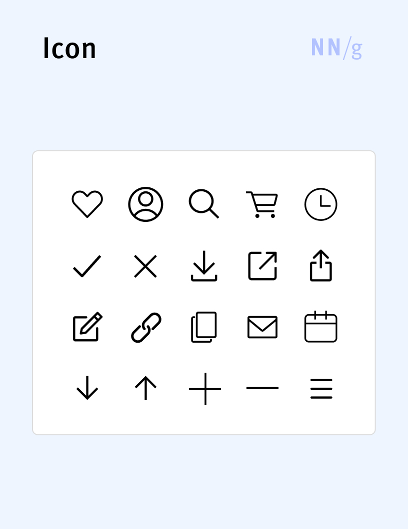 A small graphic element that is used in user interfaces to visually communicate objects, actions, or ideas. Icons often depict common objects (e.g., a trash can, a pen, a magnifier glass) and are usually meant to represent actions or tools available in the interface (e.g., the trash-can icon stands for delete, the pen icon for edit). Some icons can serve to punctuate information (for example, an exclamation-point icon may appear next to an error message) and attract attention. Most icons should be used in combination with text, to make sure that users recognize what they mean.