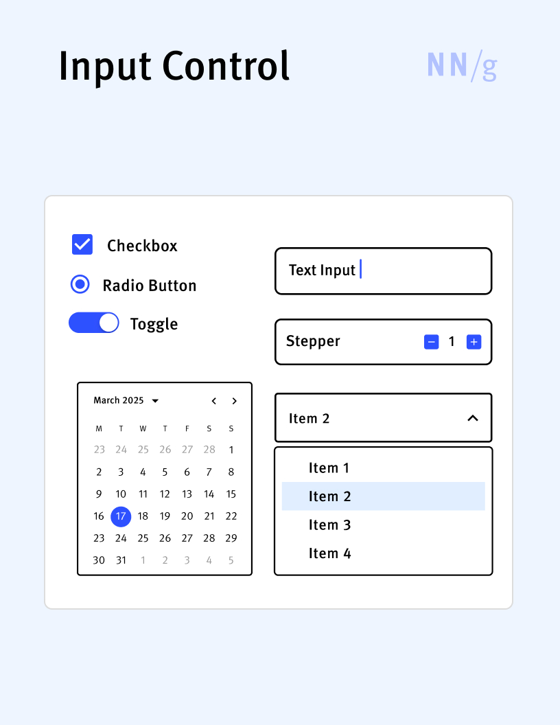 Any UI component that allows users to input information into a system. Examples include textboxes, checkboxes, radio buttons, sliders, toggles, and pickers.
