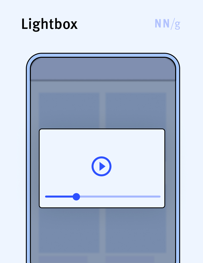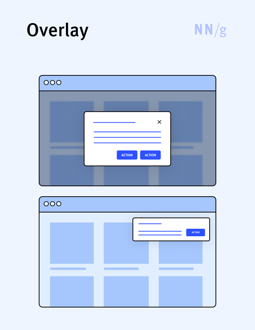 A UI element used to display content on top of existing page content. Overlays can be modal or nonmodal and can cover the entire screen or just a part of it (in which case, the background is often dimmed). When they occupy the whole page, overlays can be easily confused with regular web or application pages and cause user disorientation. Often the term is used interchangeably with “popup” and “lightbox.”