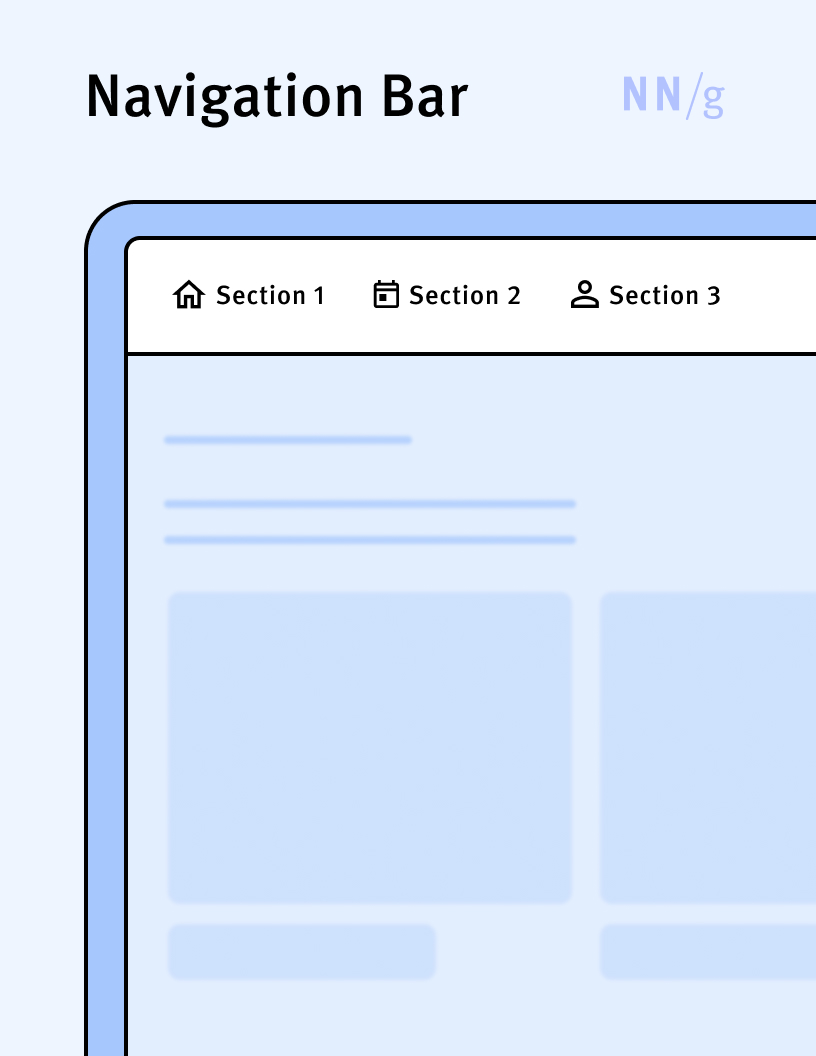 A type of navigation menu implemented as a menu bar hosting navigation categories. Navigation bars are among the most common navigation UIs and can appear on both mobile and desktop platforms.