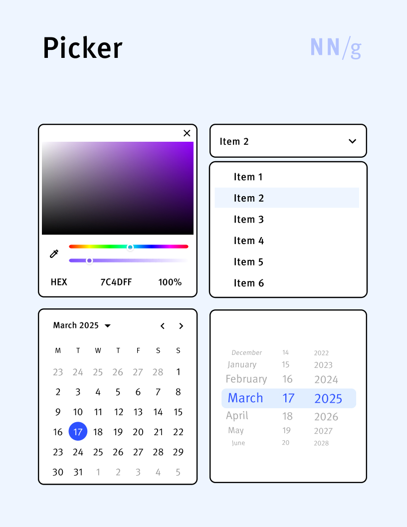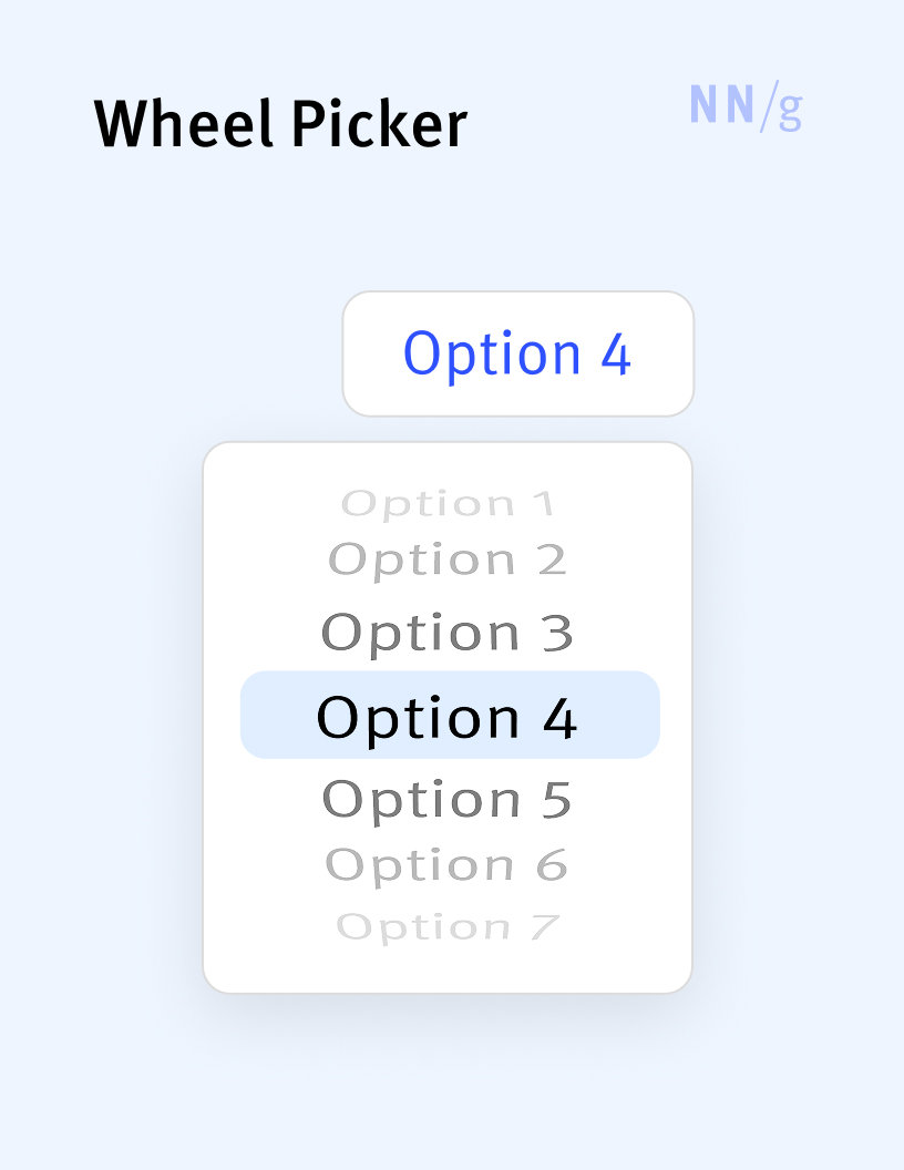 - See also: dropdown list, radio button, wheel-style picker, calendar picker