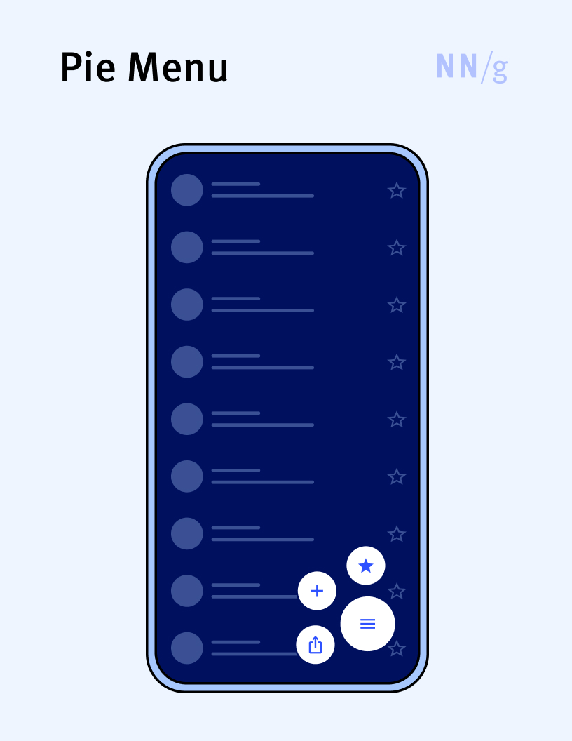 A type of expandable menu in which all the menu options are placed on a circle centered on the menu handle. This type of menu has the advantage that all options inside the menu are equally close to the handle and, thus, the time to reach them is the same. Pie menus were introduced in the late 1980s, but they have never been very popular, even though there have been attempts to use them in mobile apps.