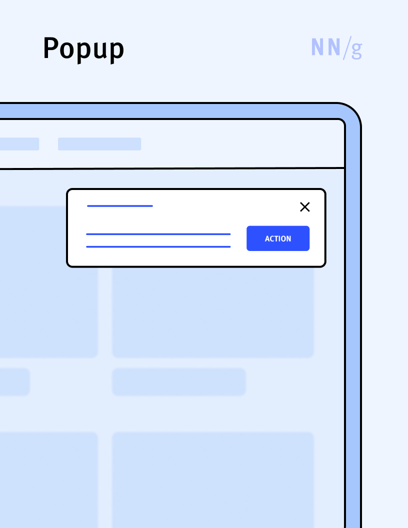 An overlay that does not occupy the whole screen. Often the term “popup” is used interchangeably with “overlay” and “lightbox.” Apple uses “popover” to refer to popups in iOS, iPadOS, and MacOS applications.