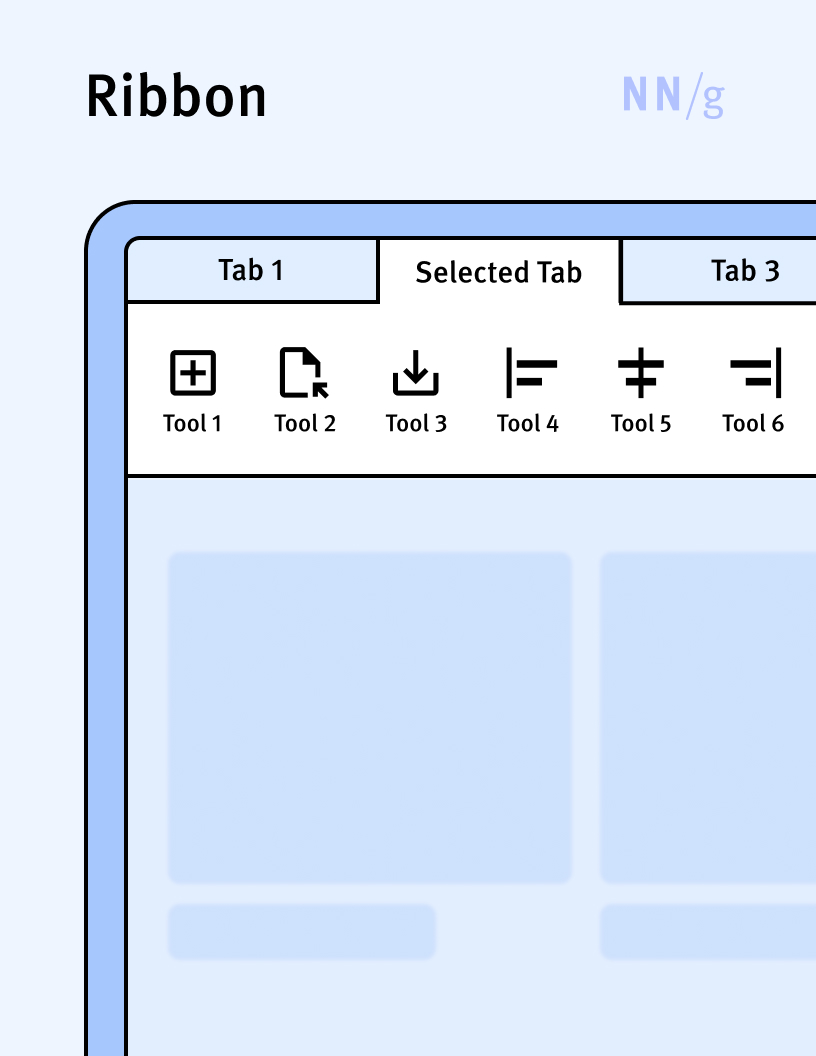 A UI element that presents various controls and tools grouped into a set of tabs. Each tab contains commands specific to a particular activity (for example, the Home tab may contain basic functionality, whereas the Insert tab may include commands related to adding other objects). Within a tab, the commands are typically displayed as a horizontal list.This type of interface is primarily used in applications and was popularized by Microsoft in its Office suite. Its equivalent on the web is the tab bar.