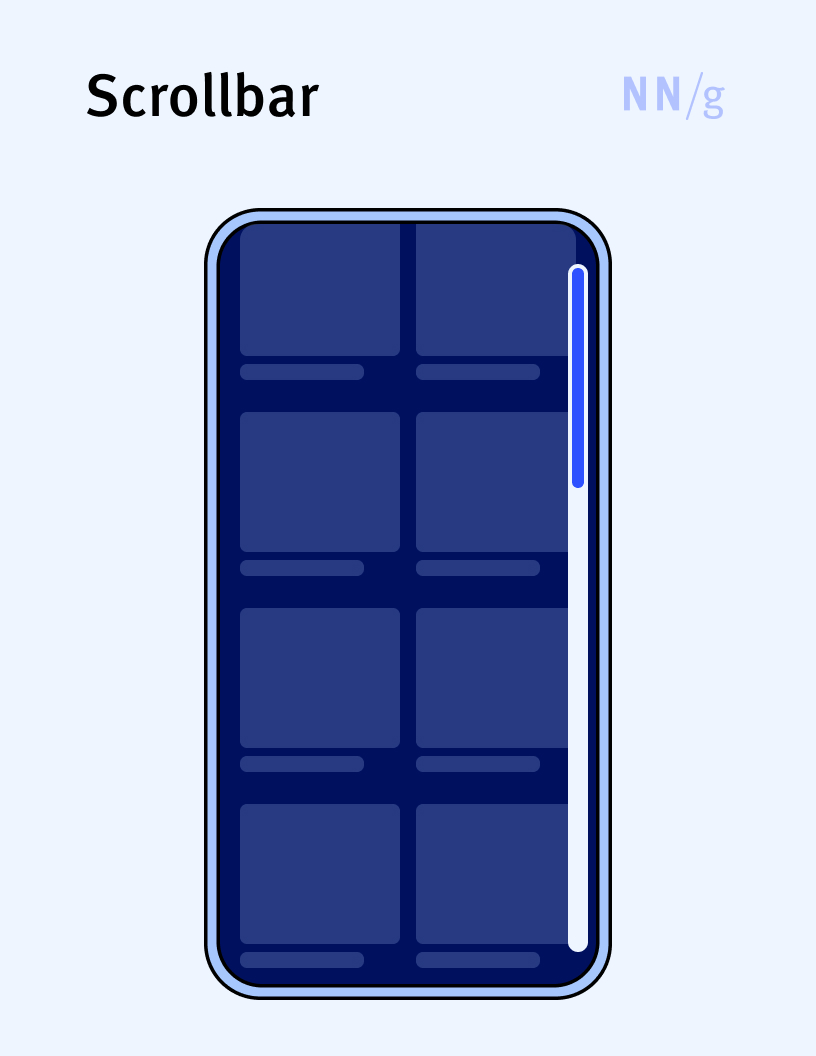 An element used to indicate and control the portion of a container or page that is visible on the screen. A typical scrollbar consists of a track (the area the scrollbar slides within) and a handle, which can be dragged to scroll through the content. In modern user interfaces, scrollbars often appear only when needed — that is, when the content overflows the current viewable area — and may disappear when the user does not interact with the page. Users can interact with scrollbars by clicking and dragging the handle, clicking on the track to jump to a specific position, or using arrow buttons at the end of the bar for step-by-step navigation.