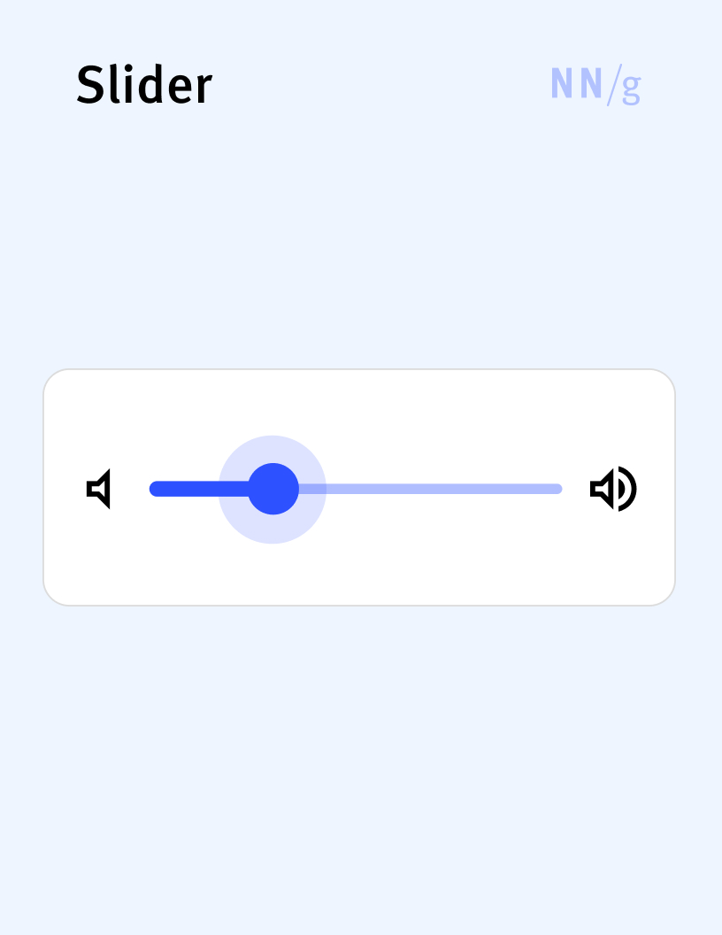 A UI element that allows users to adjust a value or navigate through a range by moving an indicator, called a handle, along a horizontal or vertical track. Sliders are a type of range control; they are appropriate in situations where the exact value may be hard to quantify for the user (e.g., for volume or brightness adjustments).