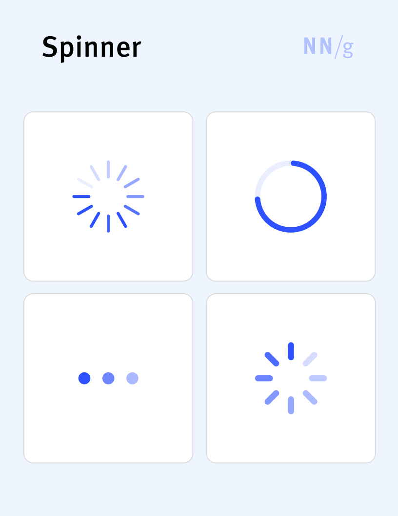 A type of progress indicator used to signify that a process is ongoing. It is usually depicted as an rotating circle or another simple animation. Spinners do not give users information about what portion of the process is already completed and how much time they have to wait, so they should be used only for very short processes (with an estimated duration of under 3 seconds).