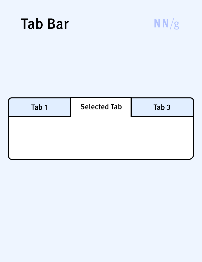 A user-interface element that allows users to selectively view a single panel of content from among a list of available options (tabs). The list of options (tabs) is traditionally displayed horizontally; each option represents a concise description of the content found in that tab. When the user clicks on a tab, the selected tab’s content appears underneath (or, on mobile, above) the tab bar. Tab bars are like ribbons, but while ribbons are primarily used for organizing commands in applications, tab bars are used for organizing content both on web pages and in applications.