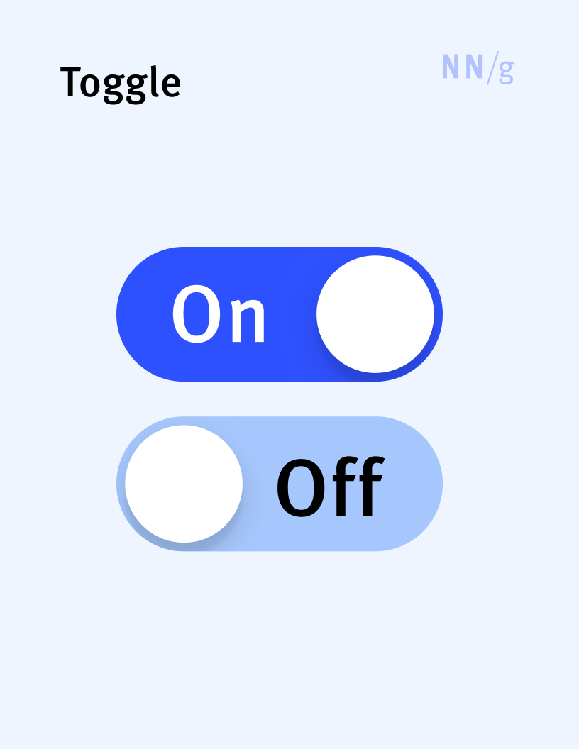 A state-switch control usually depicted as a slider between two positions: on and off. It is the digital equivalent of a physical on-off light switch. Toggles need to clearly indicate the current state through a distinctive color and explicit labeling.