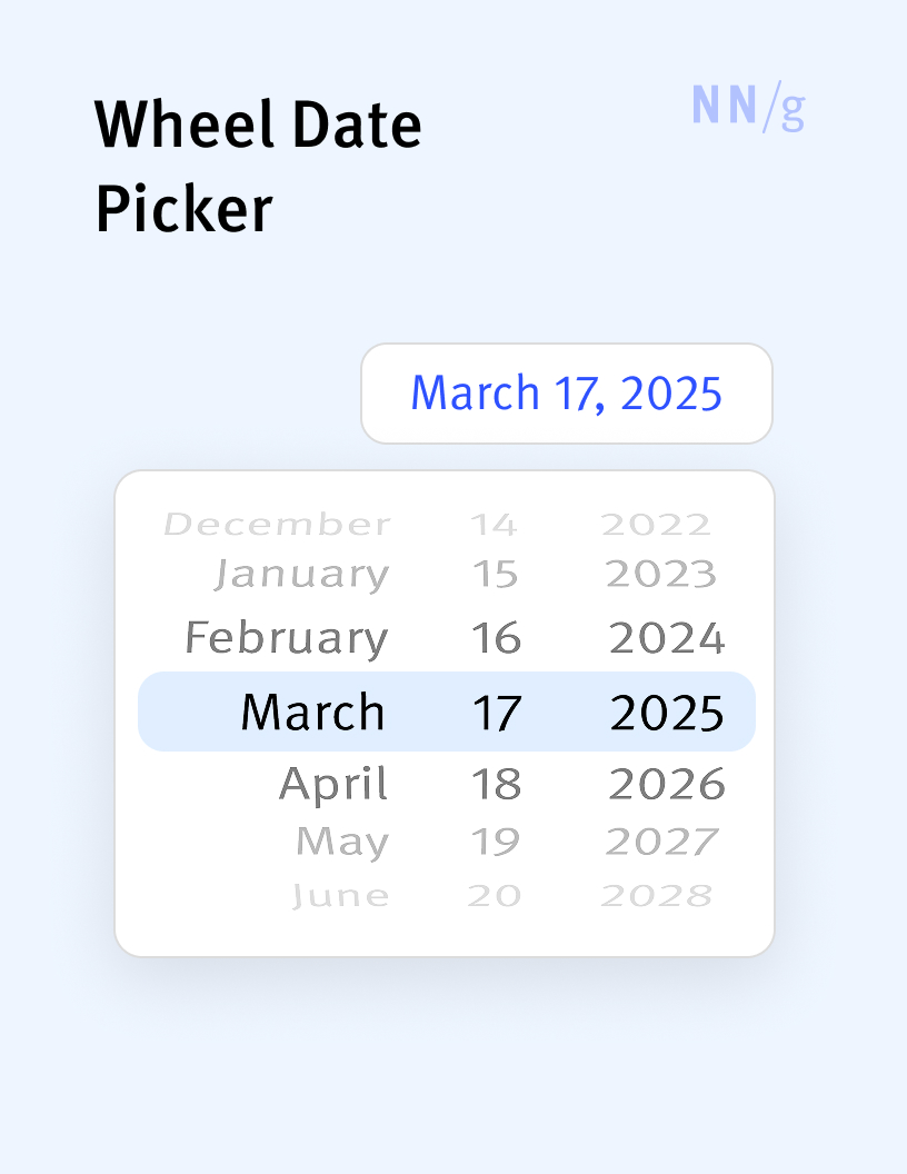 An iOS-specific date picker that lets users select date and time values using a rotating wheel-like interface. Each component of the date—day, month, and year—and sometimes time, is represented on individual “wheels” that users can spin vertically to select values. Wheel-style date pickers are less usable than calendar pickers because users may have to scroll a lot to reach the date they want to input.