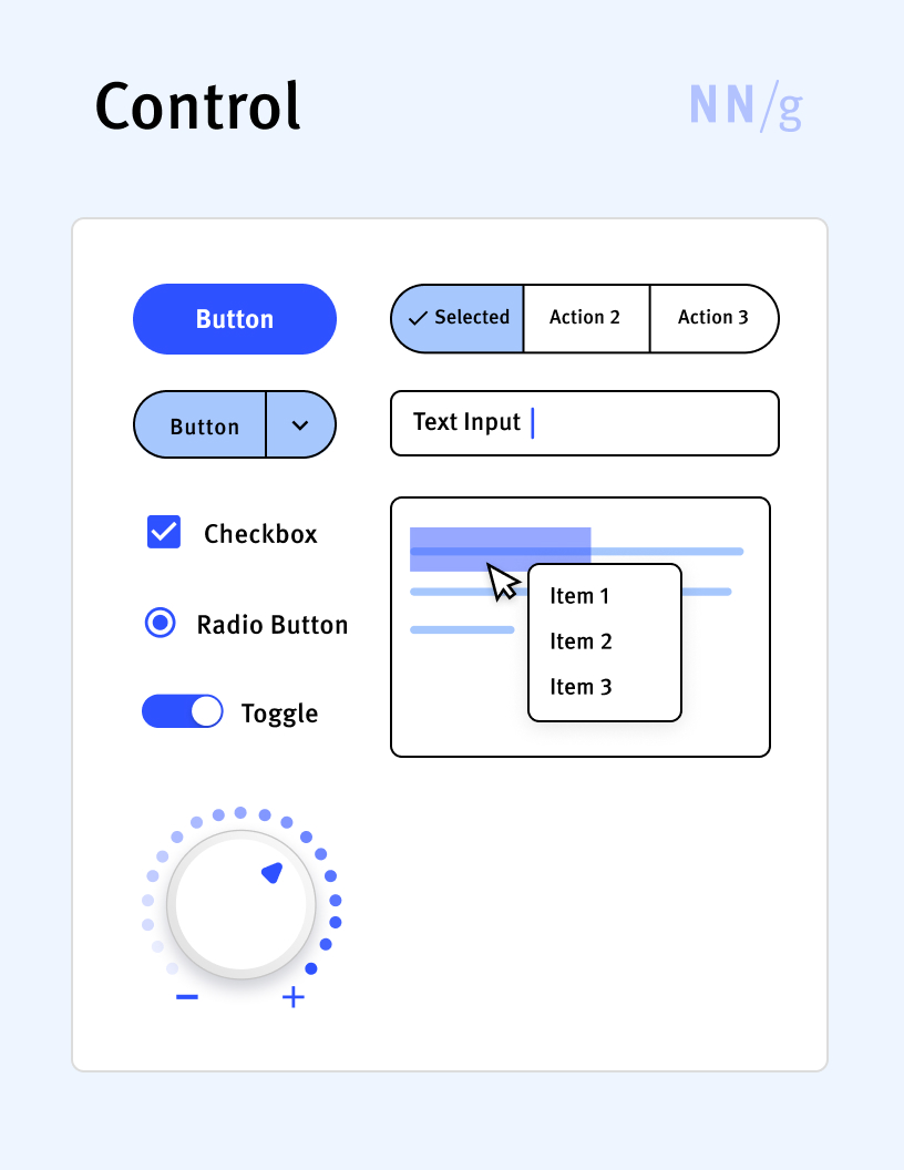 Any interactive UI element that allows users to perform an action or to input data within an application or website. Buttons, textboxes, and menus are all examples of controls.