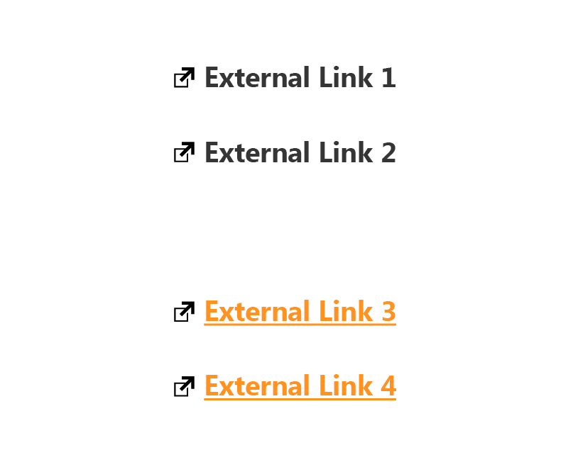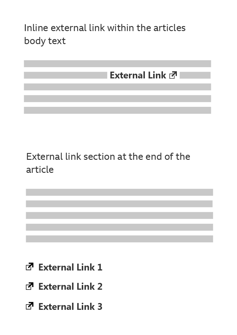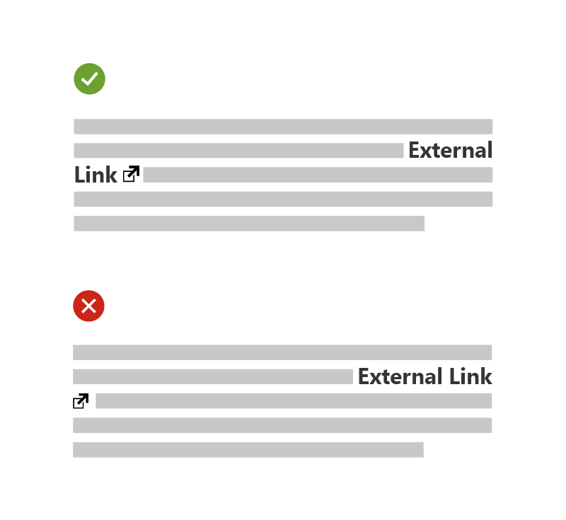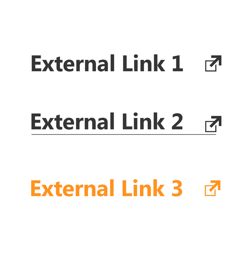 For inline external links, the icon should appear to the right of the text. As a single component, the link’s text and icon will share styling characteristics. These could include underlines, colour changes etc.